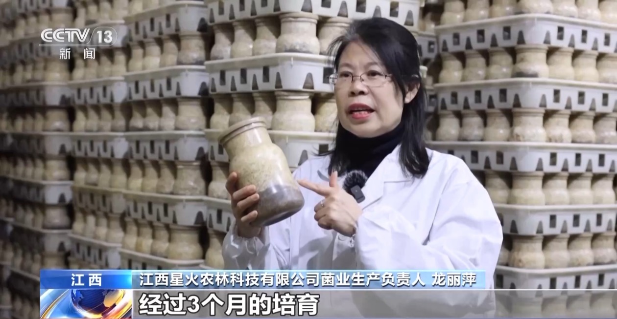 江西星火农林科技有限公司菌业生产负责人 龙丽萍:这是以油茶果壳和木屑为基质制作的菌瓶,经过3个月的培养,就能长出茶香白鲜菇,一年可以为企业带来1000多万元的利润。